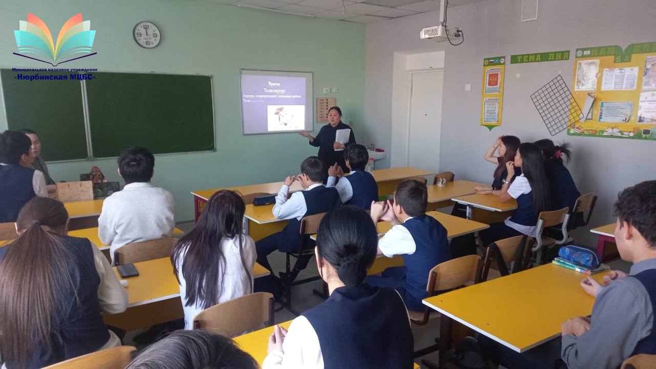 Профориентационный урок 8 «а» кл.в МБОУ Нюрбинской МП Гимназии им. С. Васильева Библиотекарь Убоянской библиотеки Семенова Н.В. и библиотекарь-стажер Жарханской библиотеки Хараланова М. А. посетили