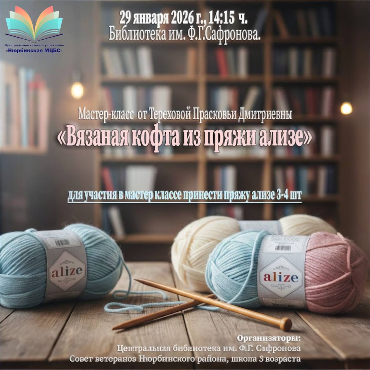 Мастер-класс по вязанию от Прасковьи Тереховой! 29 января 2026 года в 14:15 в Центральной районной библиотеке им. Ф.Г. Сафронова состоится мастер-класс «Вязаная кофта из пряжи