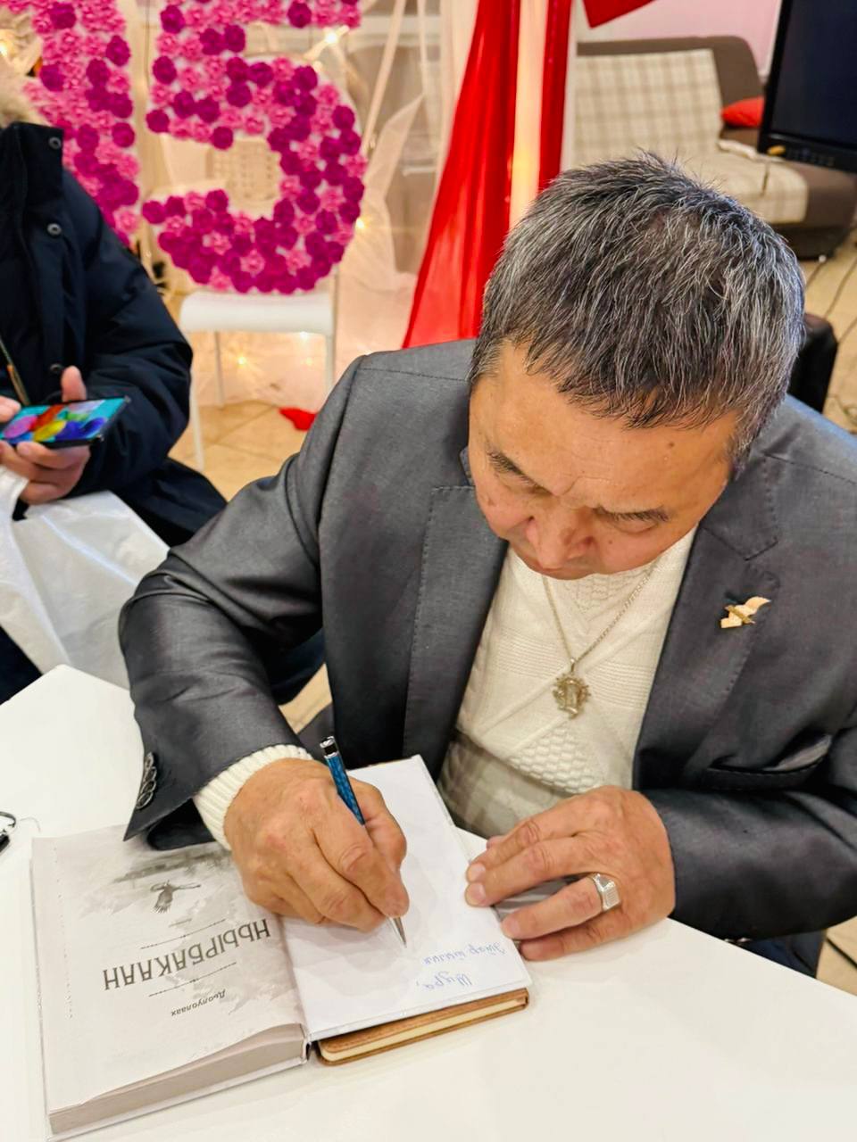 «Ньурба уоттара» айар түмсүү бибилэтиэкэ үбүлүөйүнэн анабыл хоһооннорун бэлэх ууннулар. Д.Н.Пономарев — «Дьолуолаах» көрсүһүүгэ кэлбит дьоҥҥо автографтаах кинигэлэрин атыылаата. А.П.Александров — Сахса Тар бэйэтэ мастан оҥорбут аттаах сыарҕатын Дьолуолаахха бэлэхтээтэ. Семёнова М.Е., Угапьева У., Яковлева А.А., Яковлев А.М., Ксенофонтова А.В., Федотова В.Д., Иннокентьева А.П. кинигэ туһунан санааларын үллэһиннилэр.