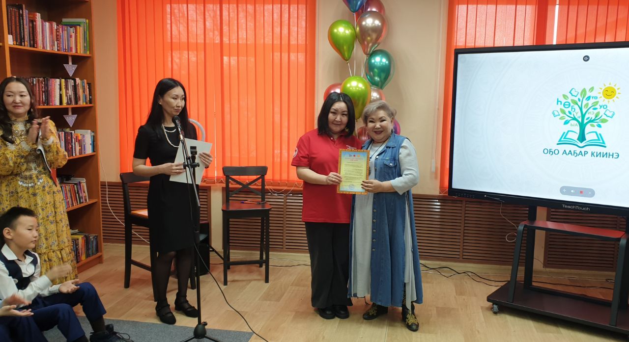Оҕо бибилиэтиэкэтин бастыҥ ааҕааччылара Афанасьева Айсаара (Ньурба 3 №-дээх оскуолатын 3 «б» кылааһа) уонна Айсиэн Михайлов (Ньурбатааҕы техлицей 5 «б» кылааһа) өрөгөйдөөх быһыыга-майгыга кунуопканы баттаан, «Оҕолорго төрөөбүт тылынан ааҕыыны тарҕатар киини» үөрүүлээхтик астылар.