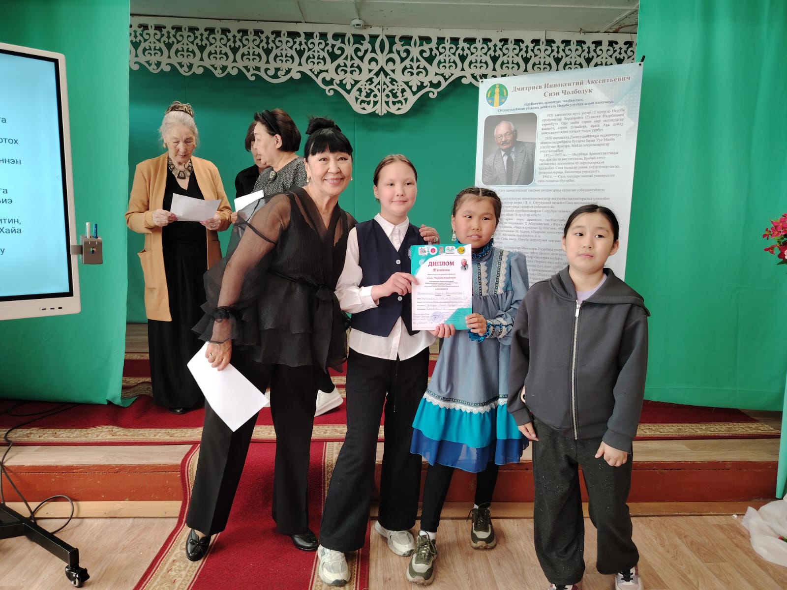 «И.А.ДМИТРИЕВ ОЛОҔО, ҮЛЭЛЭРЭ» хайысхаҕа оҕолорго кыайыылаах Ньурбачаан орто оскуолатын 11 !кылааһын үөрэнээччитэ Розанна Попова, иккис үрдэл Ньурбатааҕы гимназия 8 кылааһын үөрэнээччитэ Лилия Жирохова, үһүс үрдэл Анастасия Григорьева, Ньурбачаан 7 кылааһын үөрэнээччитэ.