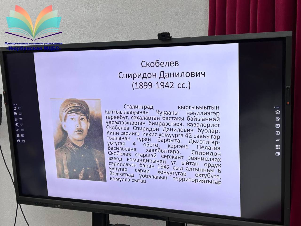 6 февраля проведен урок памяти под названием «Нюрбинцы в Сталинградской битве» в 10 классе Нюрбинской многопрофильной гимназии. Учащиеся узнали об интересных фактах героической обороны Сталинграда с июля 1942 по февраль 1943 года. Особым вниманием почтили память наших земляков из Якутии — участников той страшной битвы. На примере уроженца Чурапчинского улуса Протодьяконова Г. вместе попытались дать объяснение мужеству и отваге якутов. Затем ознакомились с историей участия нюрбинцев в обороне Сталинграда (из нашего района всего приняли участие 140 человек, из которых 113 остались в поле боя навсегда). Из воспоминаний уроженца Бордонского наслега Макарова Ф., служившего в артиллерии, ребята узнали о трудностях и бедах во время боев. А о том, как уроженец с.Чаппанда Семенов И. вывел из поля боя 47 раненых солдат и офицеров и спас им жизни было удивительно слушать. Урок прошел в твердом осознании гордости за подвиги наших солдат в переломном сражении Второй мировой войны. Урок провела заведующая ДЮБ Ушканова Я.
