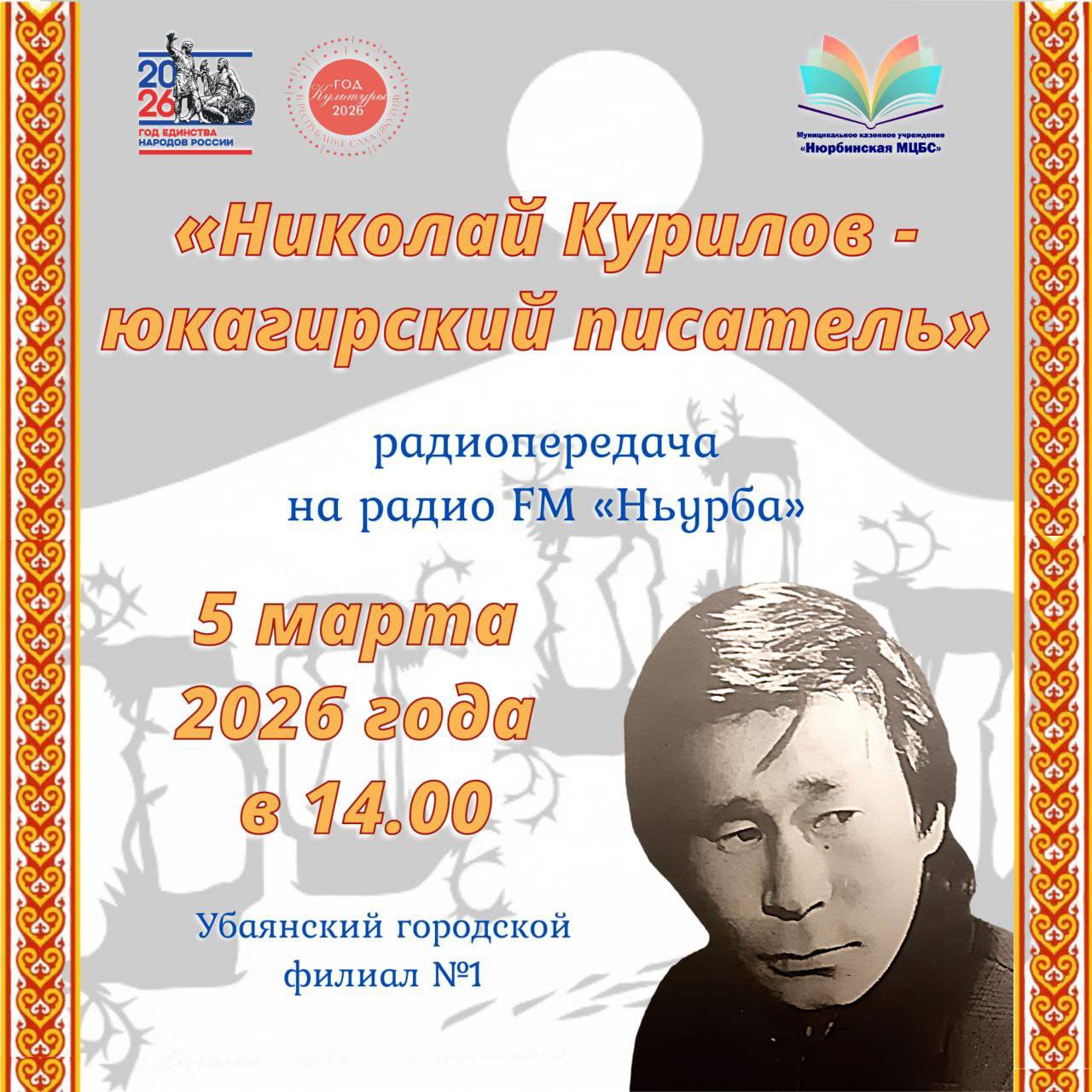 Приглашаем вас присоединиться к радиопередаче «Библиоминутка», посвящённой юкагирскому писателю. Трансляция состоится 5 марта в 14:00 на радио FM «Ньурба».